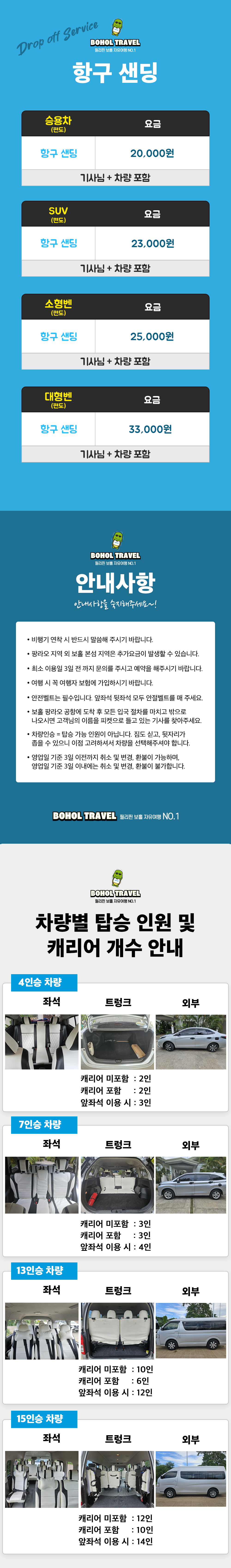 안녕하세요! 여러분의 보홀 여행을 도와드릴 보홀 여행의 동반자👫 보홀 트래블입니다!😊 🚢 숙소에서 탁빌라란 항구까지의 샌딩! 보홀 트래블은 다릅니다! ✅ 안전하고 편안한 픽업 서비스! ✅ 쾌적하고 깨끗한 차량!🚘 편안하고 즐거운 여행 현명한 소비자들의 선택 보홀 트래블 샌딩입니다. ※ 기타지역의 경우 카카오 채널로 문의 부탁드립니다※