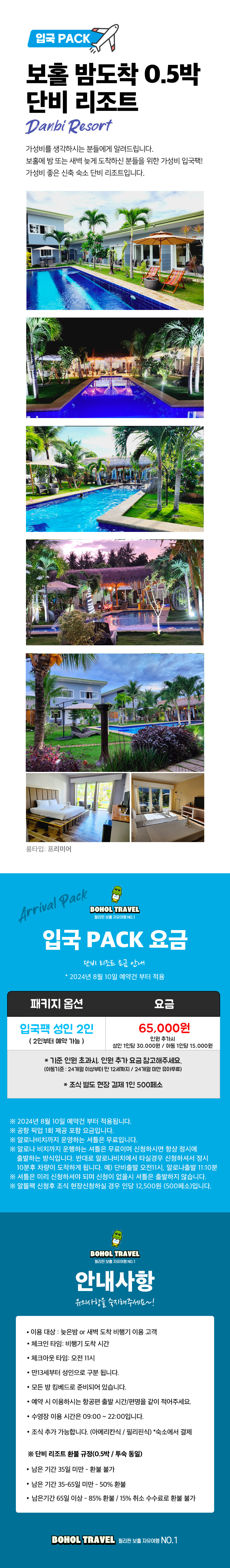 📣 단비리조트 입국팩(0.5박) * 공항 픽업 1회 제공 포함 요금입니다. * 알로나 비치까지 운영하는 셔틀은 무료입니다. (사전예약 필수) * 알로나 비치까지 운행하는 셔틀은 무료이며 신청해 놓으시면 항상 정시에 출발하는 방식입니다. 반대로 알로나비치에서 타실경우 신청하셔서 정시 10분후 차량이 도착하게 됩니다. 예) 단비출발 오전11시, 알로나출발 11:10분 * 셔틀은 미리 신청하셔야되며 신청이 없을시 셔틀은 출발하지 않습니다. ✅ 예약시 필수 확인 사항 ✔ 예약 및 결제 완료시 예약접수 상태로, 객실 가능여부 확인 후 최종 확정 여부를 안내드립니다. ✔ 확정 여부는 예약접수 완료 후 🚨영업일 기준 3~4일 이내 확정번호를 문자로 보내드립니다. - 호텔별로 확정 안내 일자가 상이함으로 대기해 주시면 빠른 안내 드리도록 하겠습니다. - 만약 객실 불가 한 경우 불가 안내 및 결제 취소 안내를 드리겠습니다.