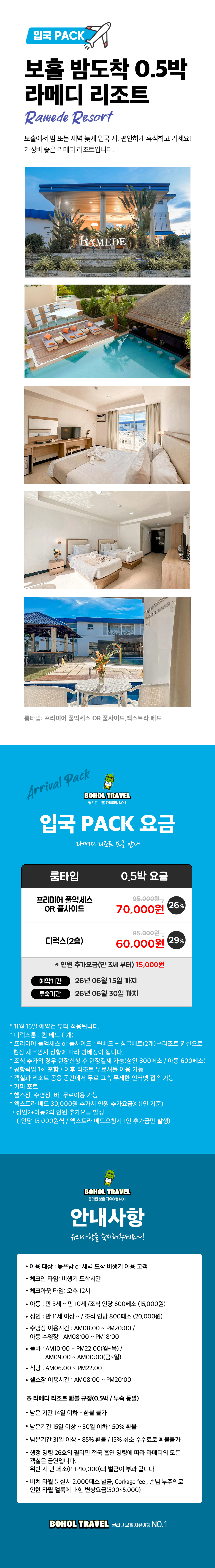 📣 라메디리조트 입국팩(0.5박) * 공항 픽업 1회 제공 포함 요금입니다. * 디럭스 룸 : 퀸베드 (1개) * 프리미어 풀억세스 or 풀사이드 : 퀸베드+싱글베드 (총 2개) └ 리조트 권한으로 현장 체크인시 상황에 따라 방배정이 됩니다. * 조식 추가의 경우 현장신청 후 현장결제 가능(성인 800페소 / 아동 400페소) * 리조트 무료셔틀 이용 가능 * 객실과 리조트 공용 공간에서 무료 고속 무제한 인터넷 접속 가능 * 커피포트, 헬스장, 수영장, 무료이용 가능 * 엑스트라 베드 30,000원 추가시 인원추가요금 X (1인 기준) → 성인2 + 아동2의 인원 추가요금 발생 (1인당 15,000원씩 or 엑스트라 베드 요청시 1인 추가금만 발생 - 30,000원+15,000원) ✅ 예약시 필수 확인 사항 ✔ 예약 및 결제 완료시 예약접수 상태로, 객실 가능여부 확인 후 최종 확정 여부를 안내드립니다. ✔ 확정 여부는 예약접수 완료 후 🚨영업일 기준 3~4일 이내 확정번호를 문자로 보내드립니다. - 호텔별로 확정 안내 일자가 상이함으로 대기해 주시면 빠른 안내 드리도록 하겠습니다. - 만약 객실 불가 한 경우 불가 안내 및 결제 취소 안내를 드리겠습니다.